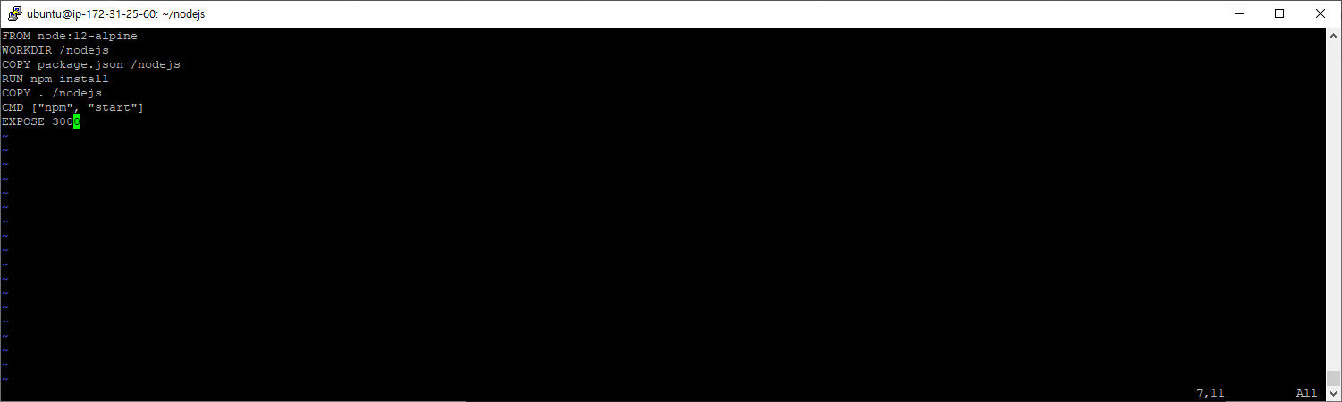 1줄은 Docker Hub에 있는 node:12-alpine 이미지 사용하기 위해 입력한 것이다.
