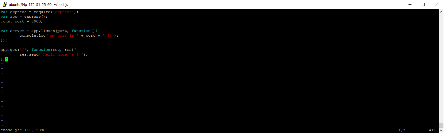 설치해둔 탄력적 IP에 포트번호 3000번으로 들어가게 되면 아무것도 없는 창에 Hello Node.js를 확인할 수 있다.