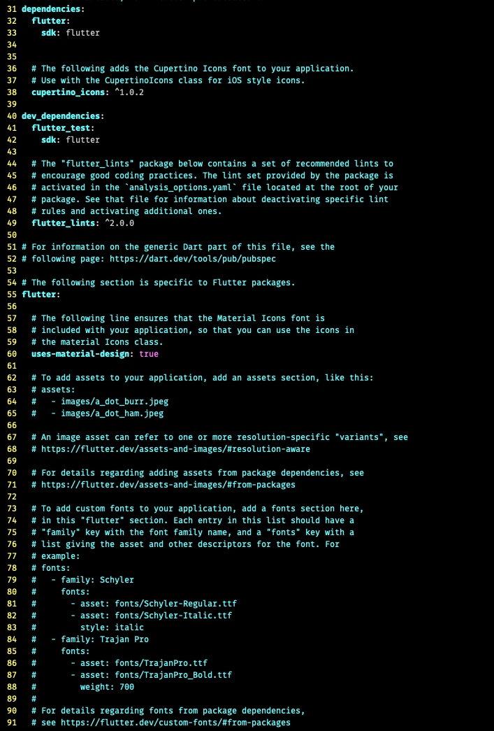 기본적으로 설정되는 pubspec.yaml 파일입니다.