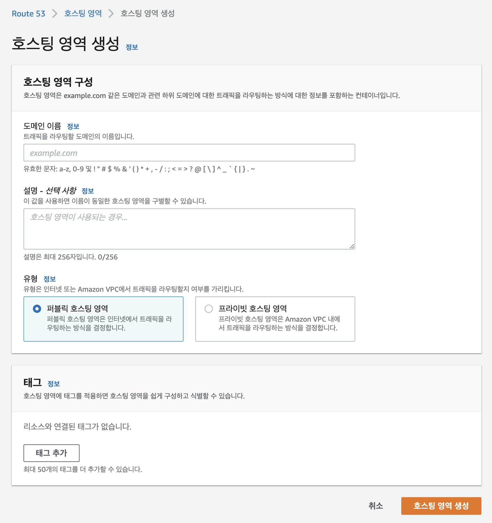 일단 route53에서 호스팅하기위해서는 도메인이 필요하다 나는 freenom에서 무료도메인을 발급받은 상태이기 때문에 도메인 발급받는 과정은 지나치고 route53에서 호스팅을 하기 위한 세팅을 해보겠다.