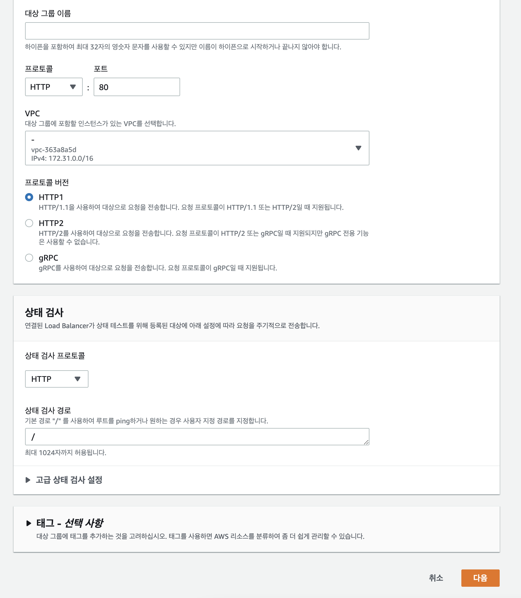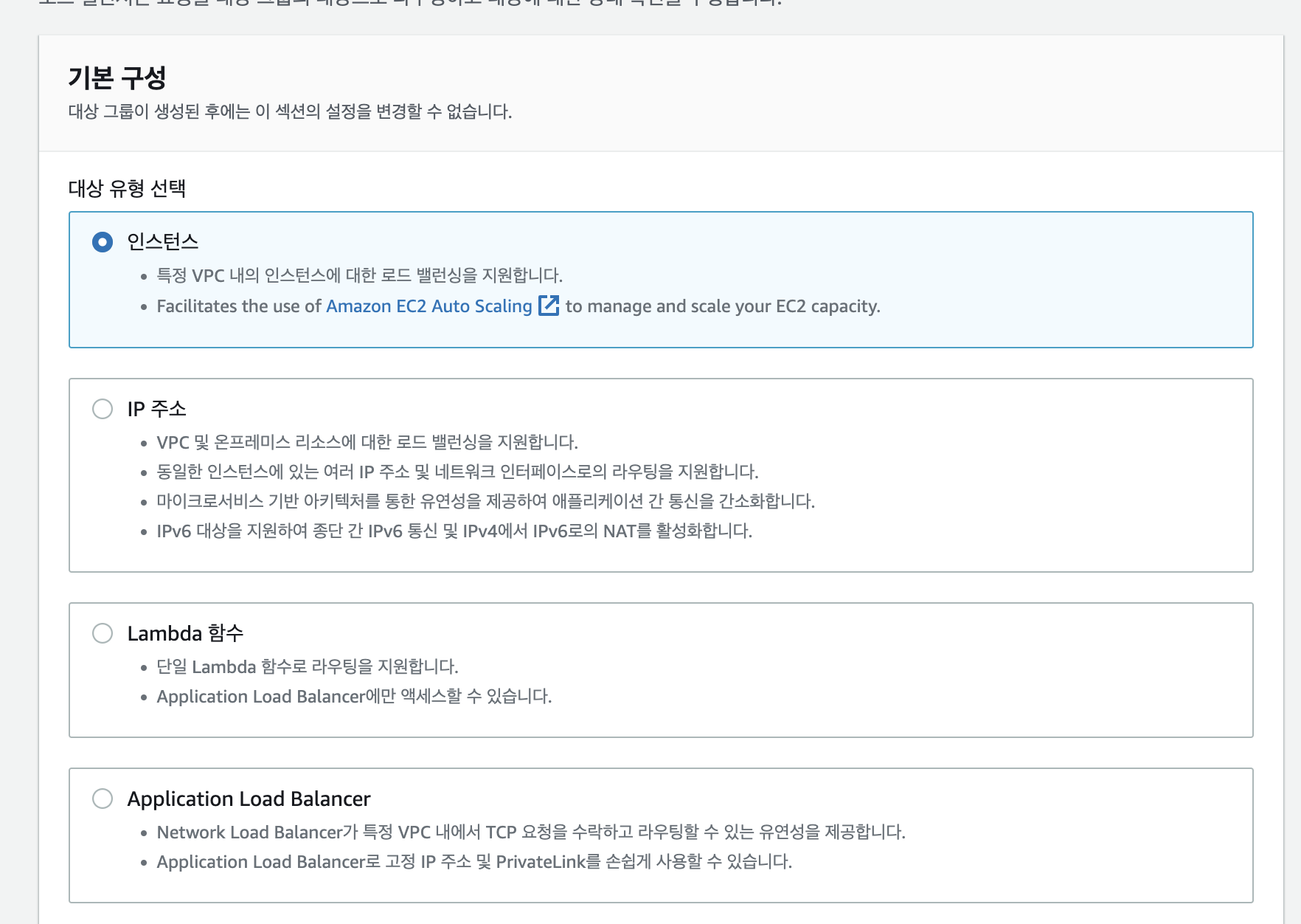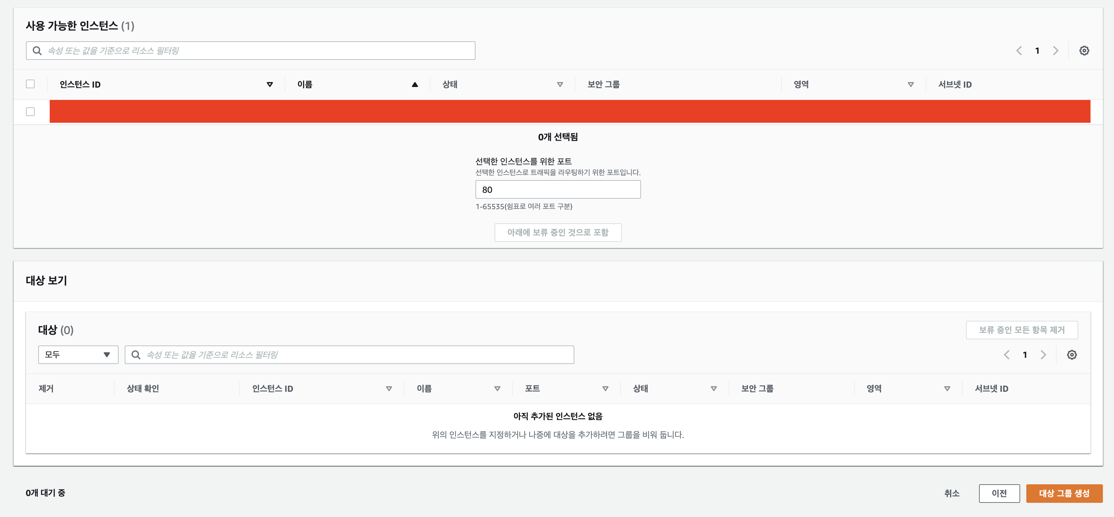 이 단계에서 로드밸런싱을 할 대상 그룹을 생성해 두지 않았다면 아래에 있는 대상 그룹 생성을 눌러서 로드밸런싱을 할 대상그룹을 설정해주어야한다.