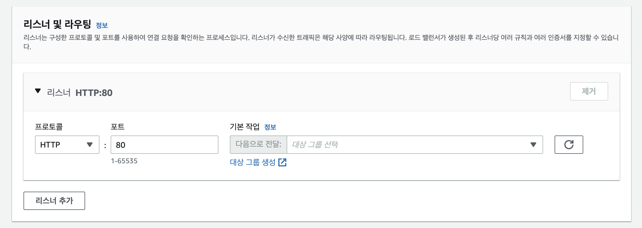 로드밸런서 탭에 다시 돌아와서 생성한 로드밸런서를 선택한 뒤 리스너 탭을 보면 아래와 같이 나와 있는데