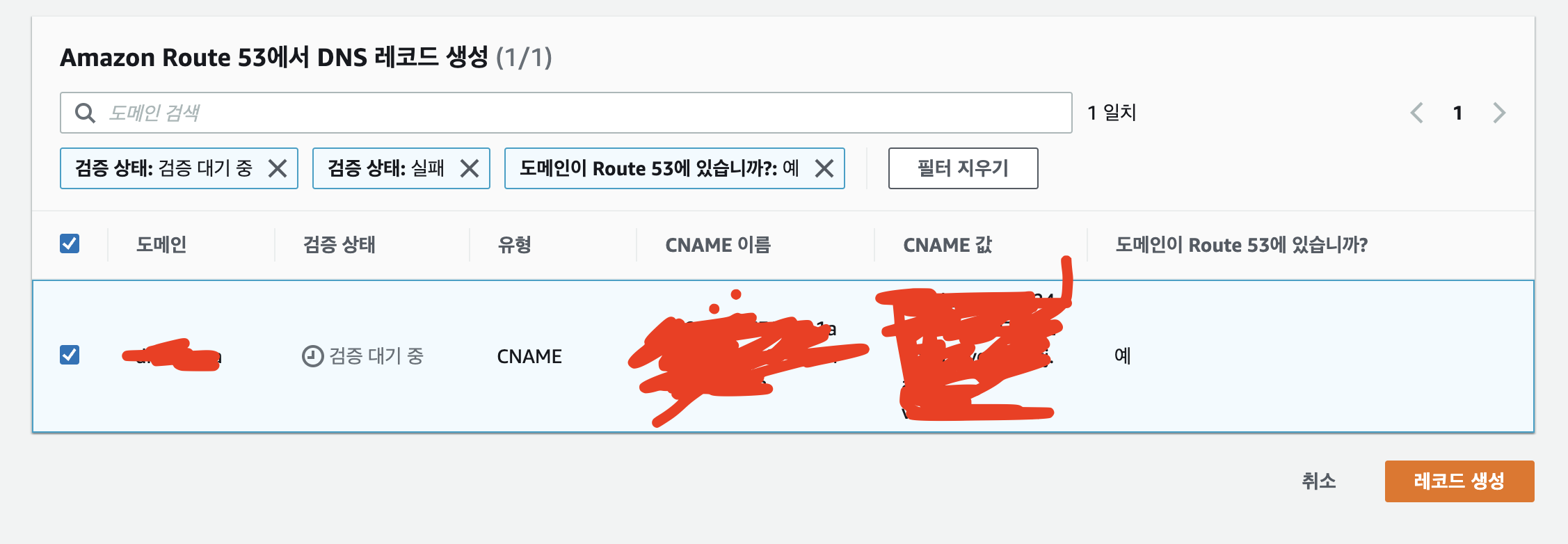 2단계에서 생성한 route53에 CNAME으로 ssl인증을 위한 레코드를 생성한다. (레코드 생성 클릭)