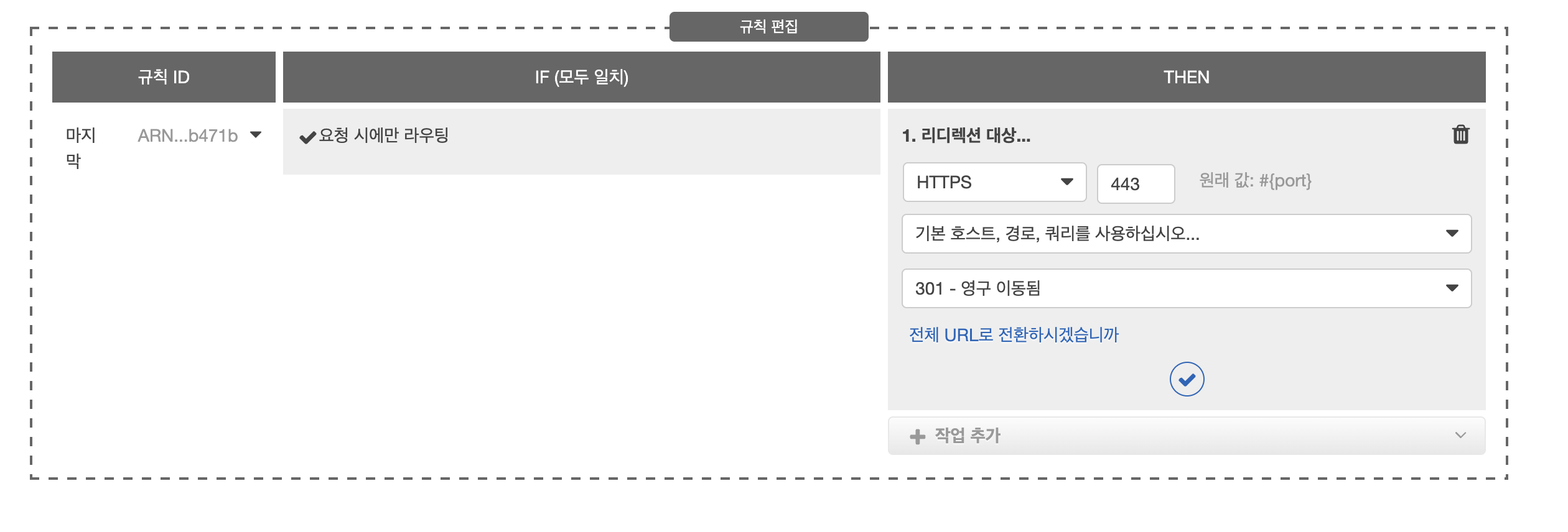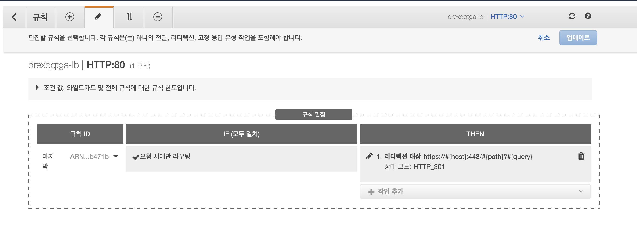 HTTP -> HTTPS 리다이렉트설정을 위해서 HTTP리스너의 규칙편집을 눌러준다.