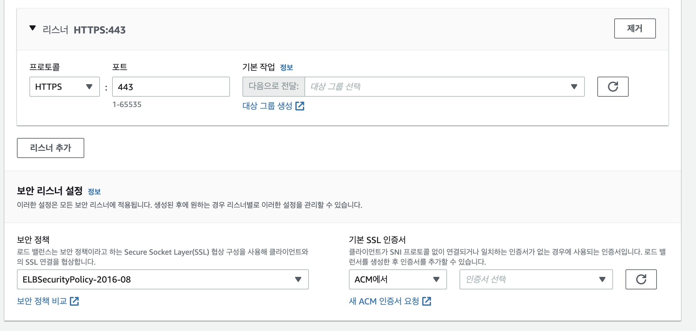 HTTPS리스너를 추가하기 위해선 보안정책과 SSL인증서를 설정해야하는데 이 때 아까 ACM에서 만든 인증서를 선택해주면 된다.